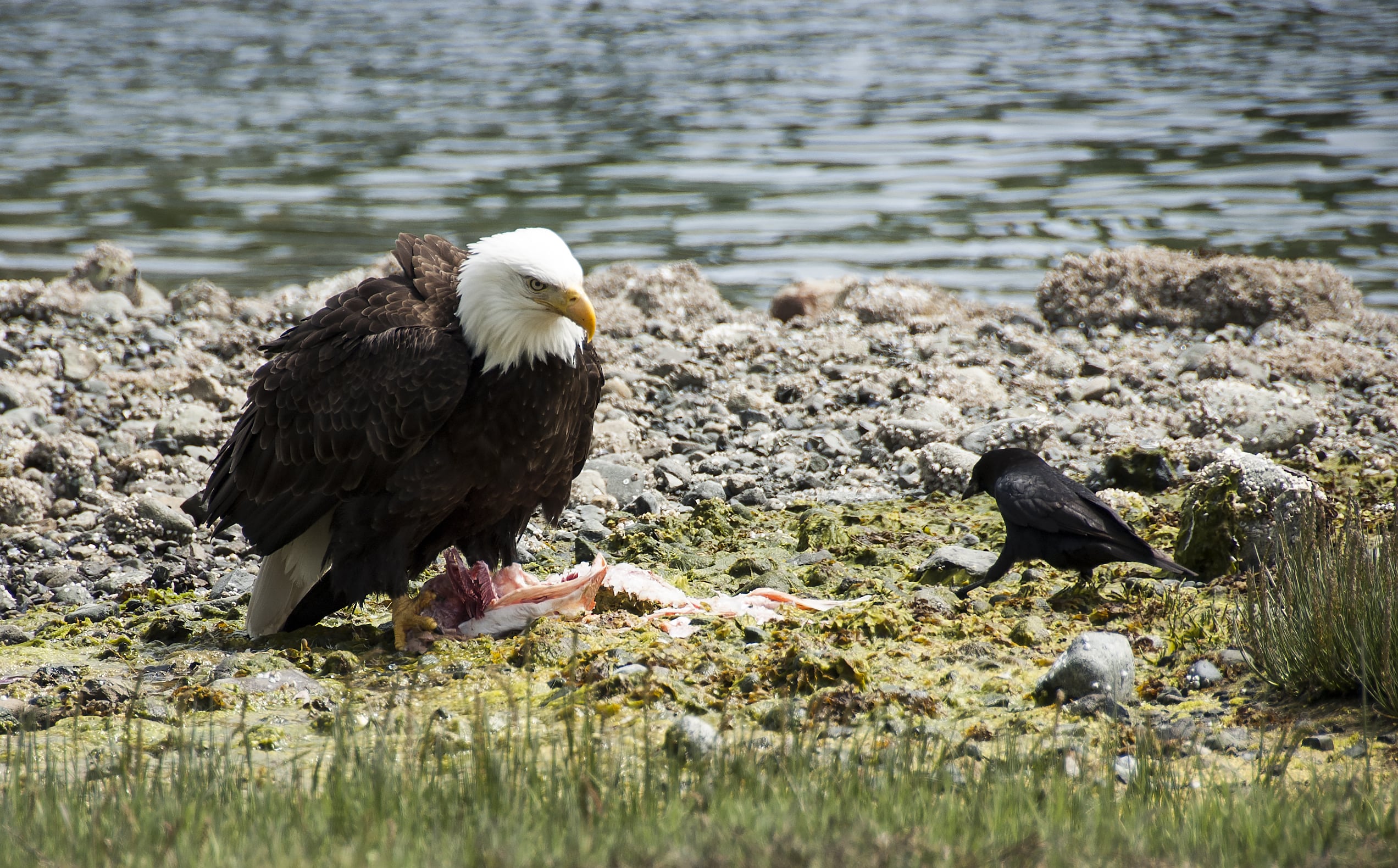 This baby crow really surprised us; that little thing was not afraid of great and stern looking, hungry Mama eagle and waited patiently for his dessert. Captured at the Pacific Rim in Ucluelet/Vancouver Island.